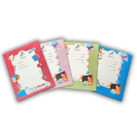 Cahier de classe 96 pages séyès 56g, format 17x22 cm avec couverture en arabe ou en anglais en fonction de la langue choisie. Cahier piqué, réglure séyès tricolore pour un meilleur confort d'écriture : marge en rouge, lignes d'écriture en violet et interlignes en bleu. Tables de calcul au verso sur la couverture. Couverture carte offset, papier vélin surfin 100% recyclé 56g.