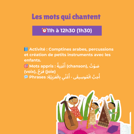 → Il apprend des mots comme “chanson”, “voix”, “joie” en arabe et les place dans de vraies phrases.