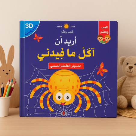 Un livre cartonné en arabe, en version 3D Pop-Up, qui met en scène une petite araignée apprenant à choisir des aliments bénéfiques pour sa santé. L’histoire est courte, visuelle et parfaitement adaptée aux jeunes enfants découvrant la lecture ou débutant l’apprentissage de l’arabe.
