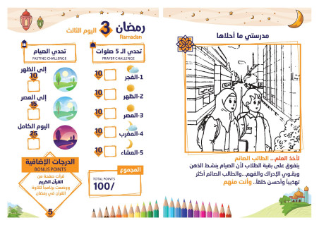 Ils y apprennent les bases du jeûne (الصيام), de la prière (الصلاة), du bon comportement (الأخلاق) et du partage (الصدقة) grâce à des textes courts et des illustrations colorées.