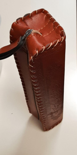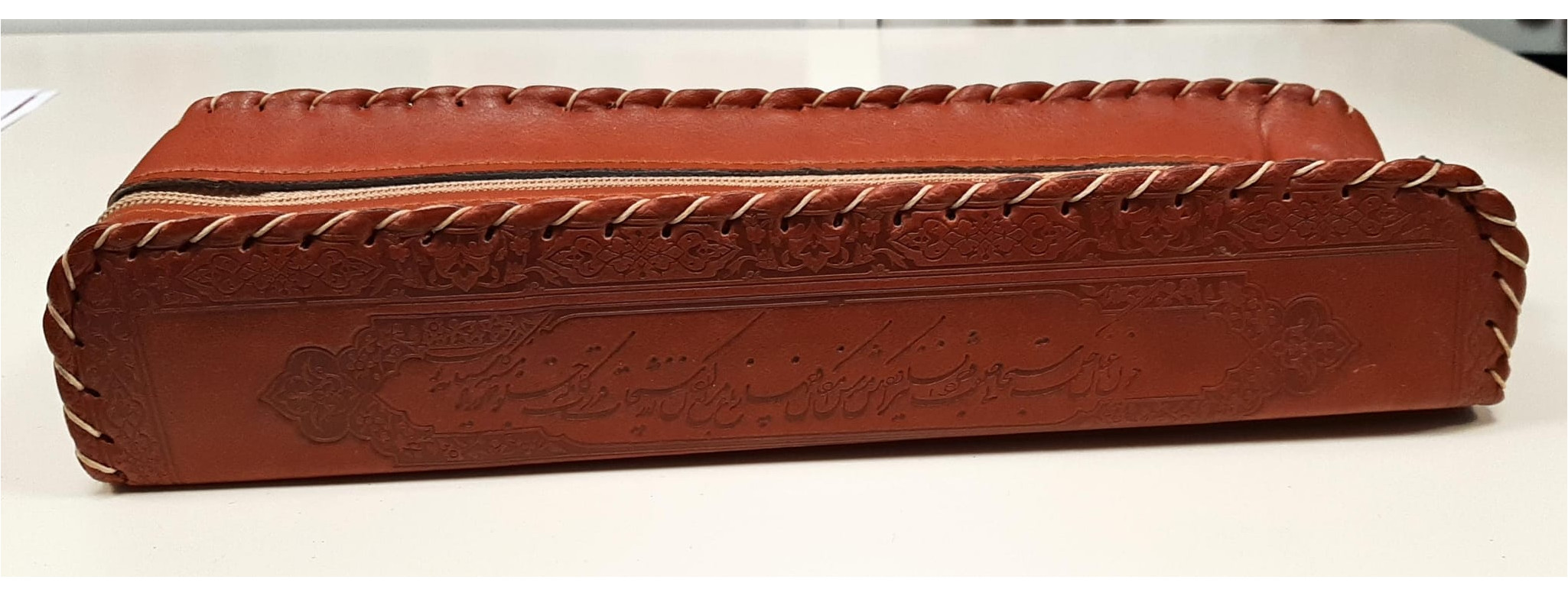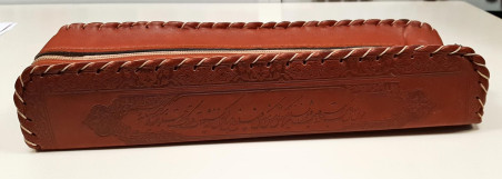Trousse calligraphiée en simili cuir avec fermeture éclaire sur la longueur.